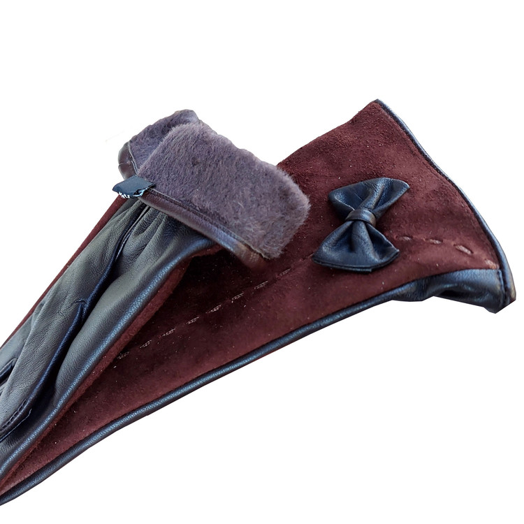 این دستکش چرم زنانه دارای آستر مخمل نرم است قسمت مچ از سمت داخل با یک کش کوچک جمع شده است بر روی مچ یک پاپیون وجود دارد این دستکش 80 گرم وزن دارد
