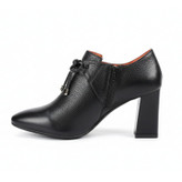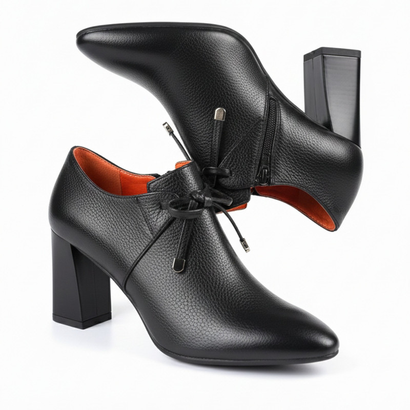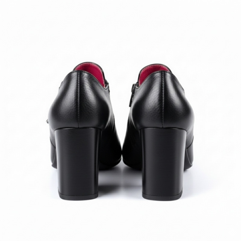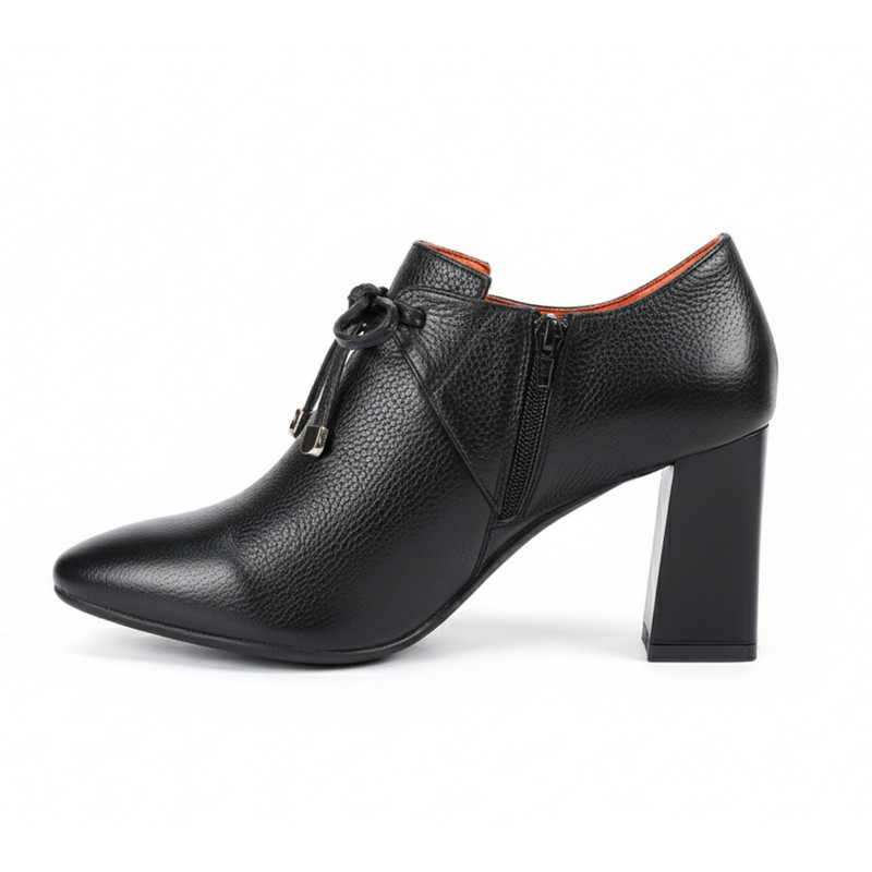 این کفش چرم زنانه شیک ترکیبی از سبک بوت کوتاه (آنسال) و کفش رسمی پاشنهدار است. از بهترین نوع چرم طبیعی با بافت نرم و مقاوم ساخته شده است که دوام و زیبایی کفش را تضمین میکند و با گذشت زمان، انعطافپذیرتر و همسان با قالب پای شما خواهد شد دارای پاشنه پهن و محکم با ارتفاع متوسط تا بلنداست که ثبات و راحتی بیشتری نسبت به پاشنههای باریک فراهم میکند. در قسمت رویه کفش، یک تزئین پاپیونی کوچک و ظریف وجود دارد که به زیبایی و جلوه آن میافزاید. برای سهولت در پوشیدن و درآوردن، یک زیپ در کناره داخلی کفش تعبیه شده است. این مدل برای استفاده در محیطهای کاری، رسمی ، نیمهرسمی و یا استایل روزمره شیک در فصول پاییز و زمستان مناسب است
